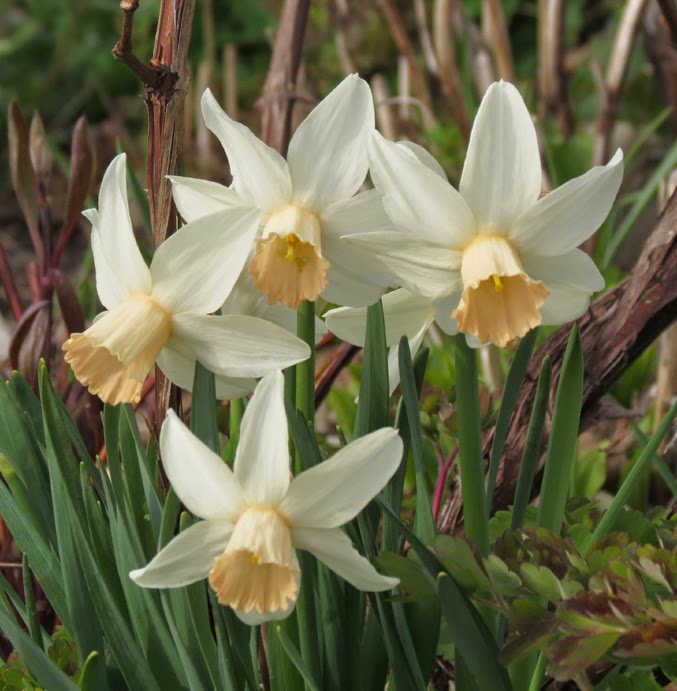 Jämfört med förra året är våren sen. Då blommade till exempel flera tulpaner, ingen idag. Några kommer inte heller att blomma. Trots metervis med kycklingnät har rådjuren haft nattmål här, grrr.