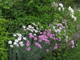 Honungsrosen 'Hybrida', Thalictrum 'Elin', spindelnät, praktbinka, kameliaschersmin, nejlikor, 'Charles de Mills', 'Zigeunerknabe (mer spindelnät), 'Blush Damask'.