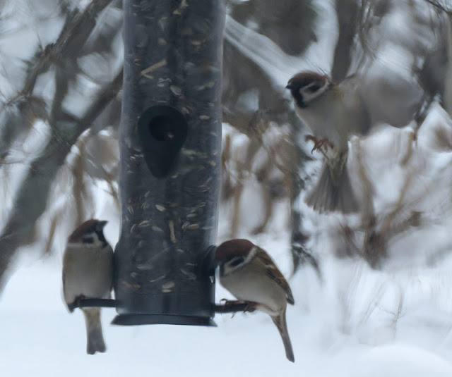 Vinterfåglar i massor. En ny matstation som invigdes idag. Tog minuter så hade de hittat den. Domherrarna plockar ifrån marken, medans de andra äter och skvätter ur. Jaja, fönstrens glas ger viss effekt vid fotografering.